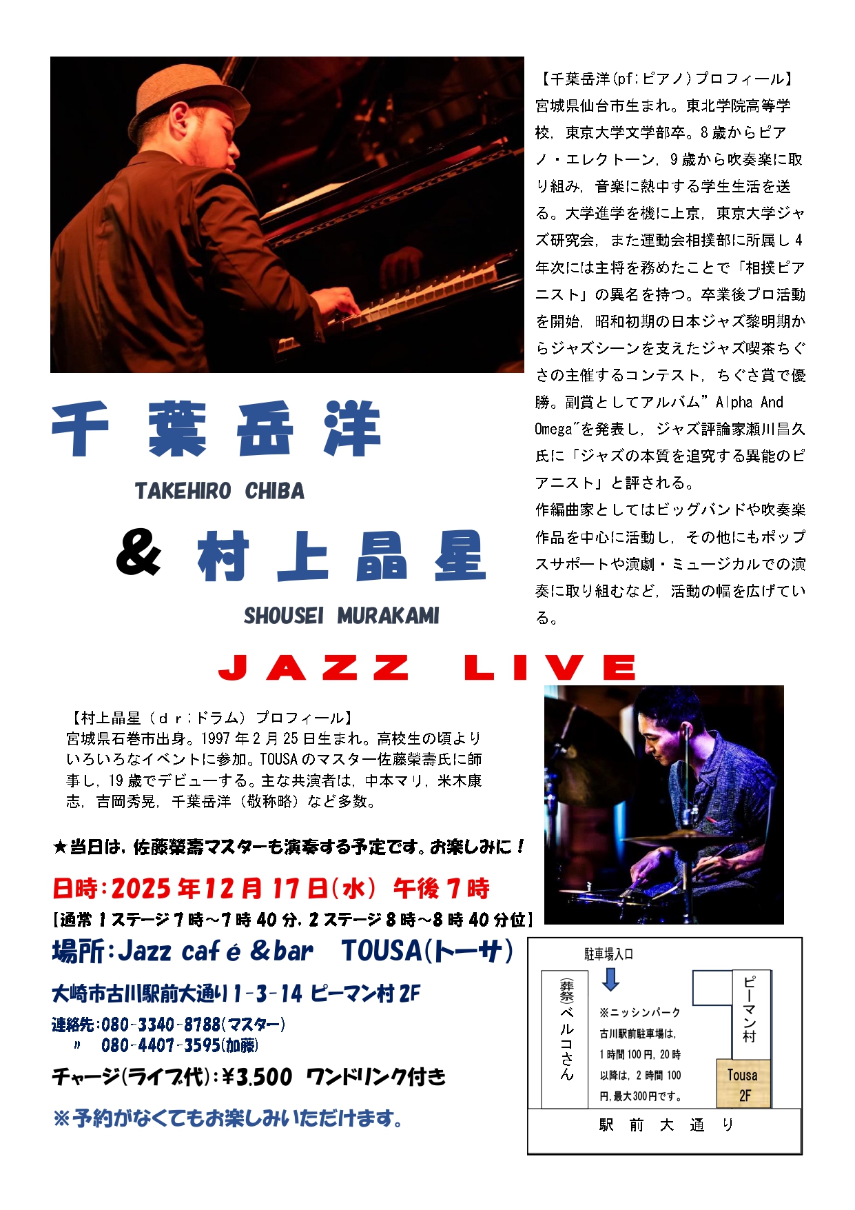 千 葉 岳 洋& 村 上 晶 星 J A Z Z L I V E 2025.12.03 イベント詳細 日付: 2025年12月17日 7:00 PM – 8:40 PM カテゴリ: イベント 日時:2025 年12 月 17 日(水) 午後 7 時 【通常 1 ステージ 7 時~7 時 40 分,2 ステージ 8 時~8 時 40 分位】 場所:Jazz café&bar TOUSA(トーサ) 大崎市古川駅前大通り 1-3-14 ピーマン村 2F