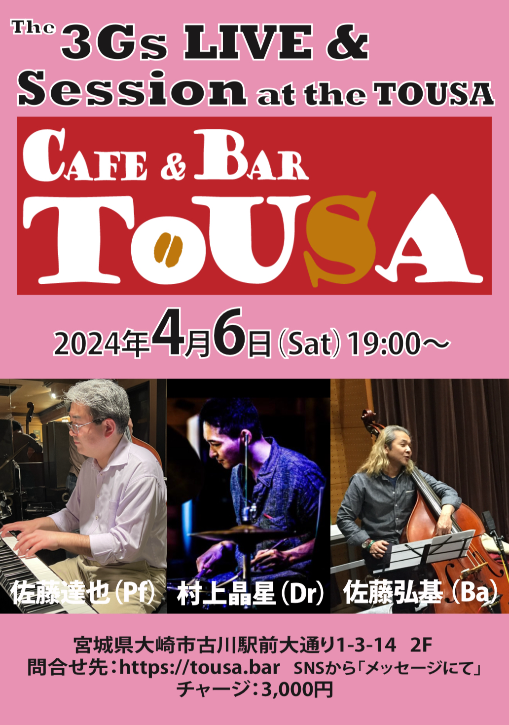 佐藤 達也(Pf) 高校生のとき、ラジオで初めてジャズを聴き、「自分のやりたい音楽はこれだ」と思った。 それから様々なジャズ音楽を聴くようになる。 大学入学時に上京し、独学でジャズを学び始める。大学院進学に伴って仙台に移り、しだいに在仙のミュージシャンと交流してライブハウス等で演奏するようになる。